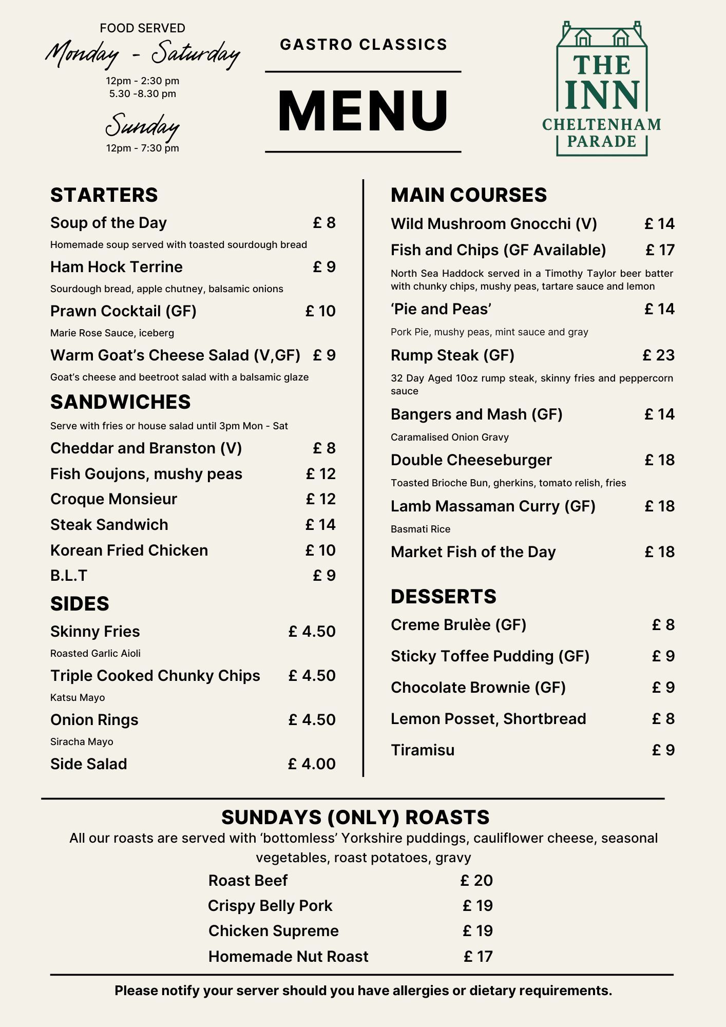 Sundays are all about comfort — generous roast dinners served with bottomless Yorkshire puddings, cauliflower cheese, roast potatoes and proper gravy. Whether you go for roast beef, crispy belly pork, or our homemade nut roast, you’ll find all the warmth and tradition of a classic Yorkshire Sunday.
