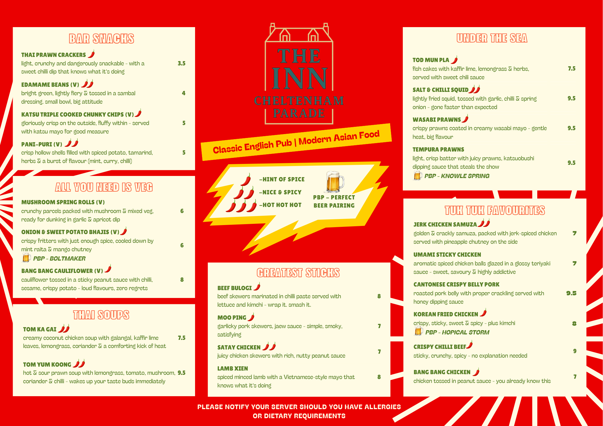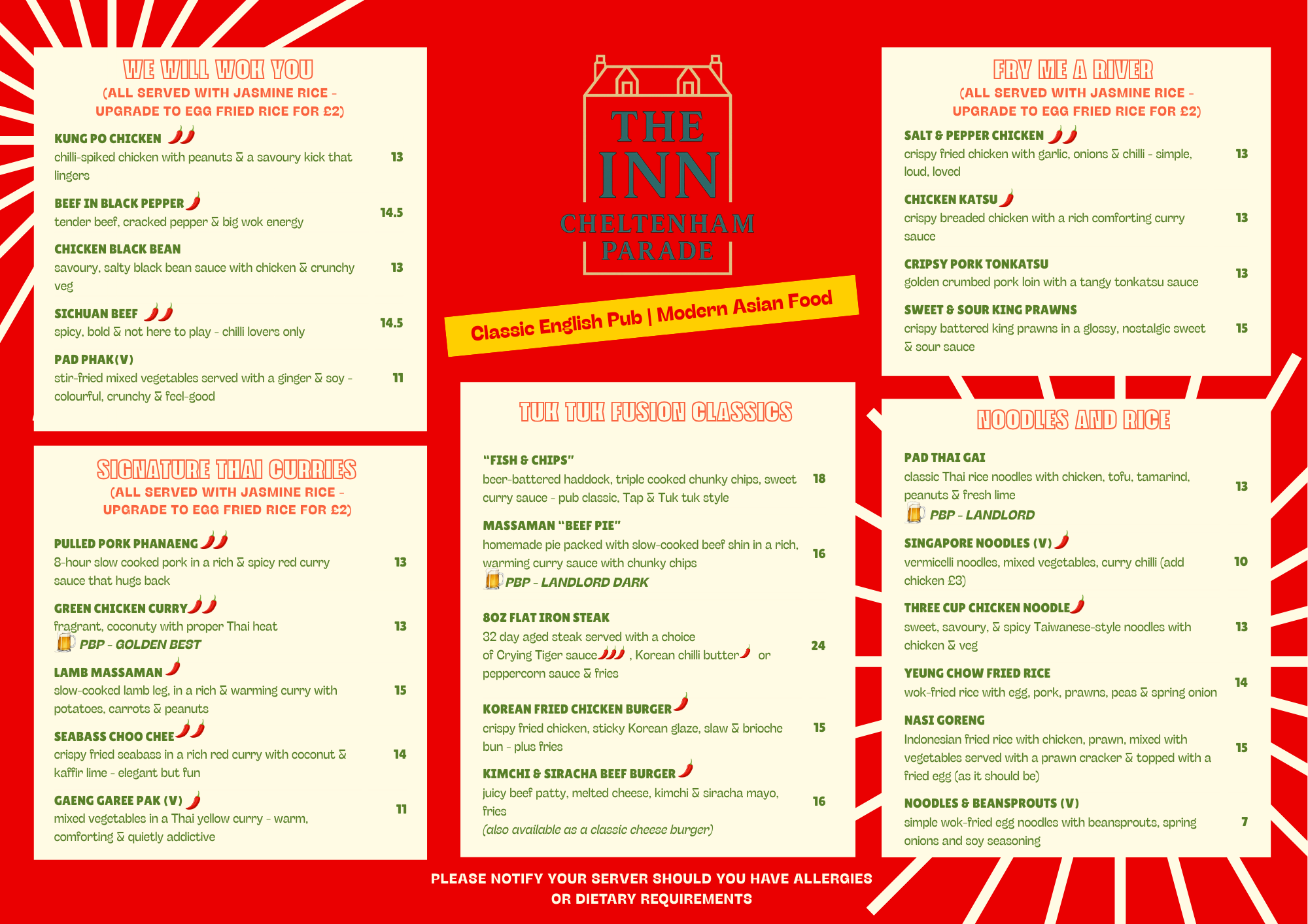 At The Inn, food is at the heart of everything we do. Our kitchen celebrates honest cooking and bold flavours — from comforting British pub classics to vibrant street food plates inspired by cuisines from around the world.